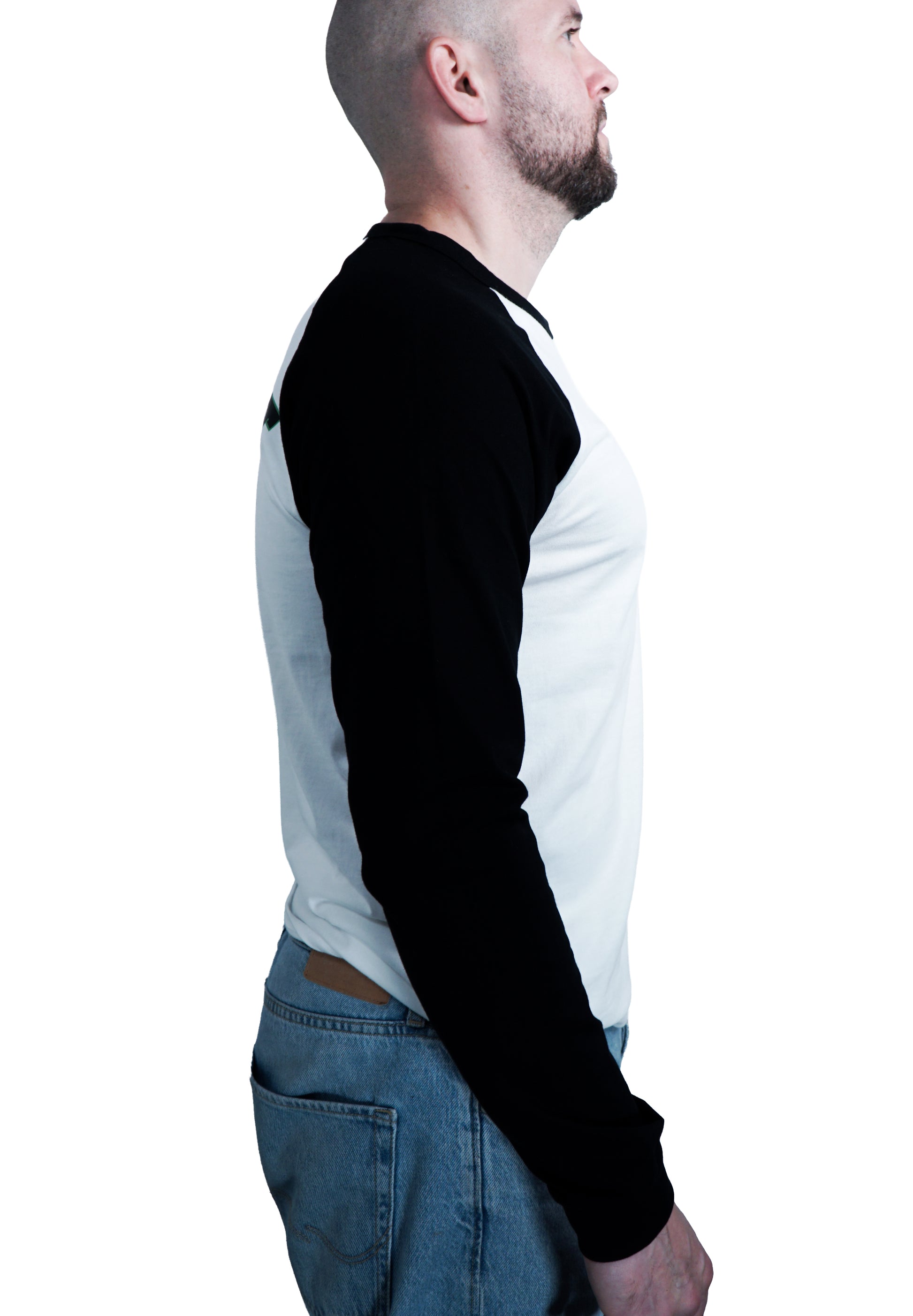 Schwarze Raglanärmel, weißer Rumpf , ein klassischer Look, der nicht laut sein muss, um aufzufallen.